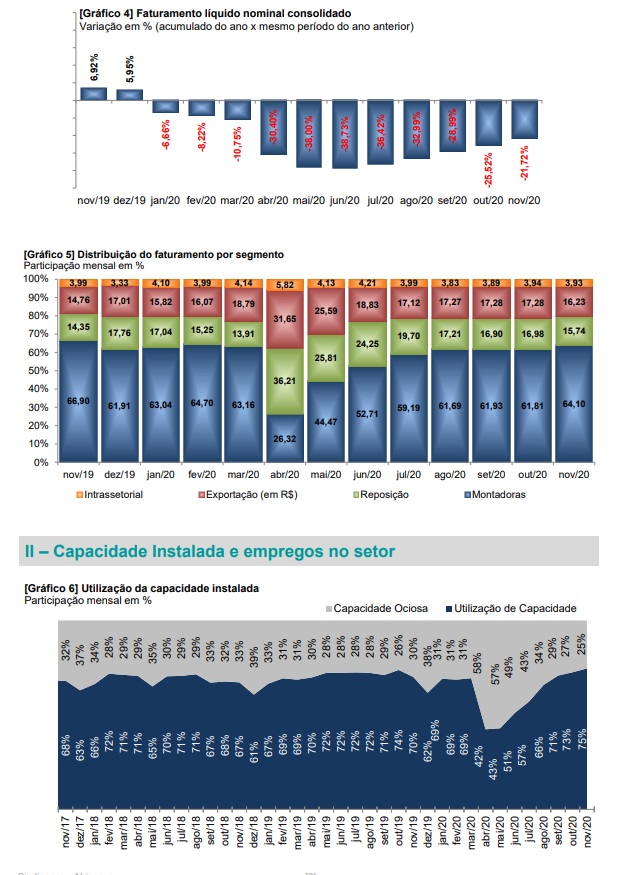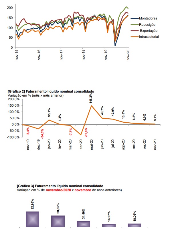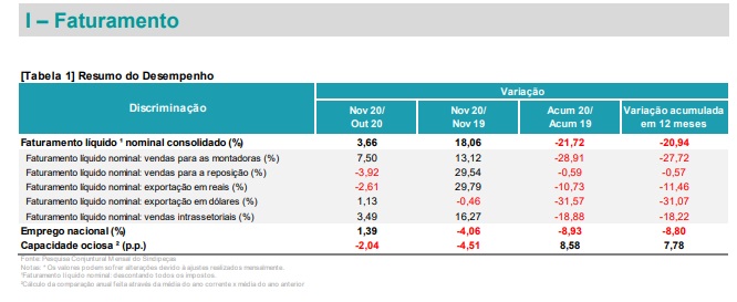 O faturamento líquido das empresas que compõem a base da pesquisa conjuntural do Sindipeças foi aproximadamente, 4% superior ao do mês de outubro. No acumulado do ano até novembro, o faturamento encara acentuada queda de 21,7% e nos últimos doze meses atingiu 20,9%. Cabe ressaltar que nos últimos meses o resultado tem sido bem melhor do que o esperado no início da pandemia.