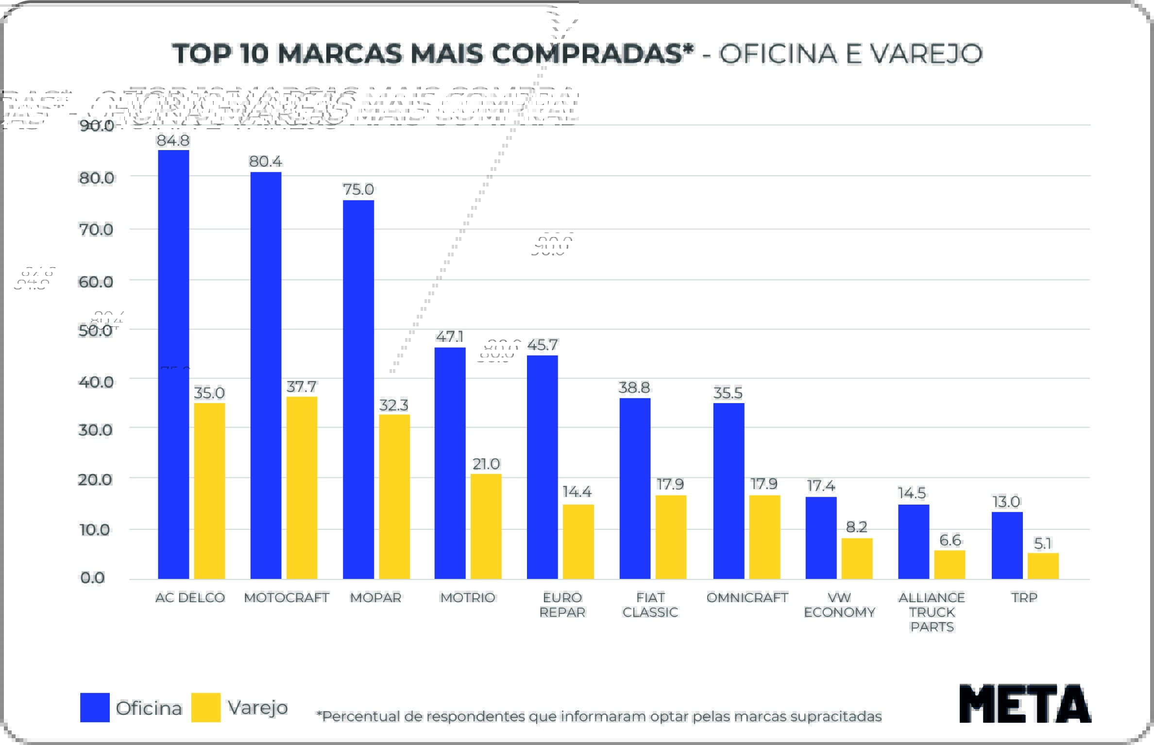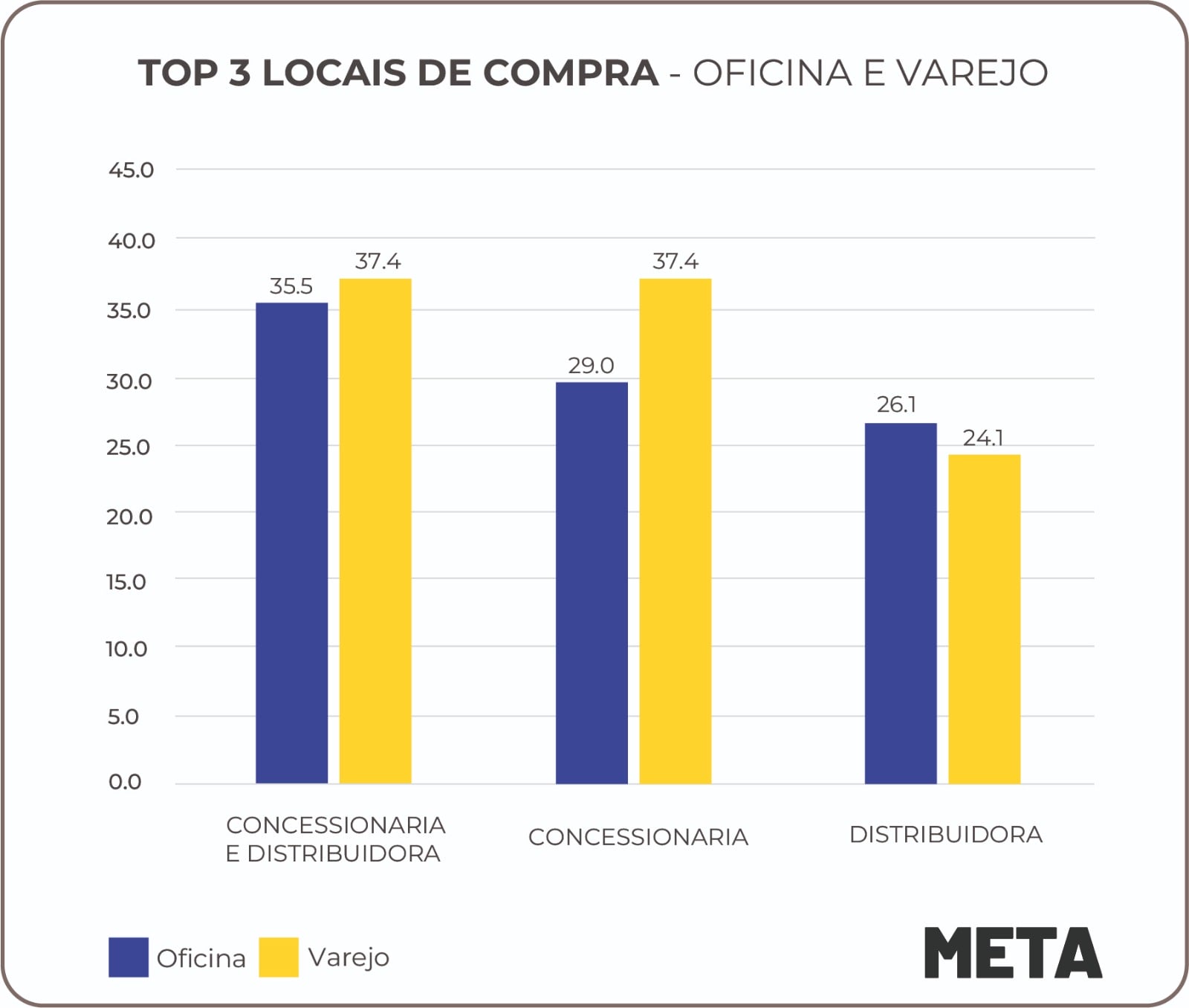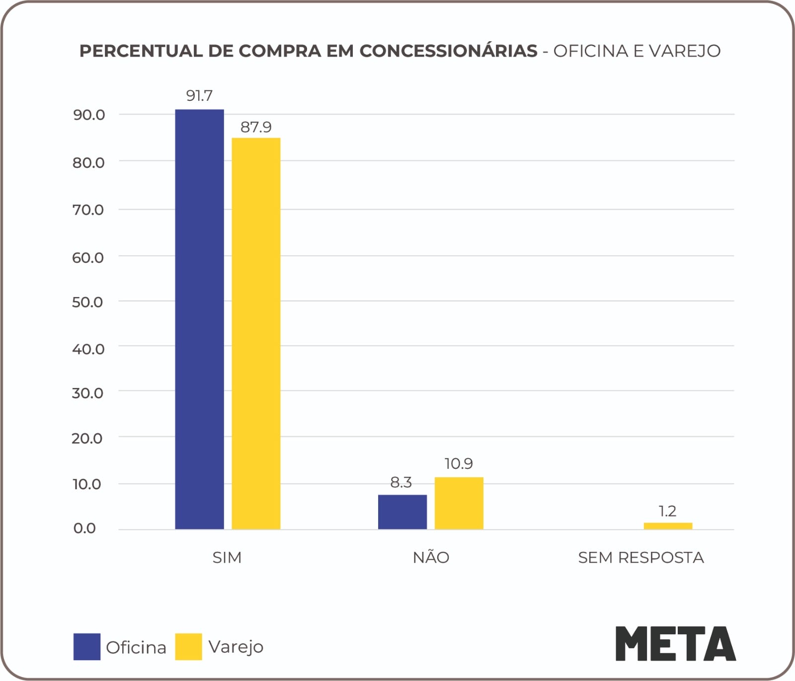 A primeira pergunta se refere a compra, ou não, de um rol de marcas específicas. Cabe destacar que o respondente é livre para citar as marcas que são por ele compradas; logo, o total de citações não se limita ao número de respondentes e tende a ser maior que o número de pessoas ouvidas, como é possível observar na tabela a seguir. Vemos que nas oficinas, a AC Delco se comporta como a marca mais comprada, sendo citada por 84,78% dos respondentes, enquanto no varejo essa posição é ocupada pela Motorcraft, citada por 37,74% dos respondentes. Quanto ao local de compras dessas marcas, vemos que nas oficinas ocorre, principalmente, nas concessionárias e distribuidoras (35,5%), enquanto no varejo, 96 respondentes indicaram que preferem adquirir itens somente da concessionária (37,4%). Se compra de concessionária, 253 respondentes do segmento de oficinas indicaram que sim, representando mais de 90% do rol de respondentes e 226 varejistas indicaram que sim, compreendendo 87,9% do total de respostas.