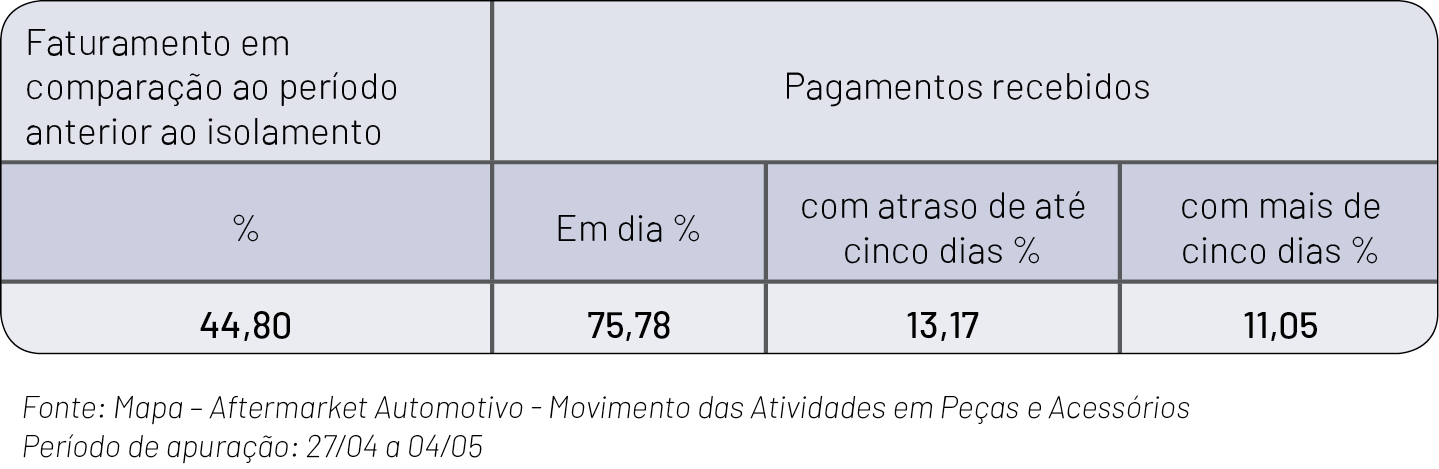 A primeira edição do MAPA apurou ainda que o varejo vem sofrendo pouco com a inadimplência: 75,78% dos pagamentos estão em dia e apenas 11,05% têm mais de cinco dias de atraso. Além de informar os índices nacionais do Movimento das Atividades em Peças e Acessórios, o MAPA apresentará semanalmente os dados regionais, proporcionando um valor inestimável para o embasamento das estratégias de toda a cadeia de reposição.