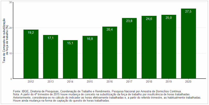 A taxa composta de subutilização (27,5%) foi recorde da série, com elevação de 4,0 p.p. em relação ao trimestre anterior (23,5%) e 2,5 p.p em relação a 2019 (25,0%).
