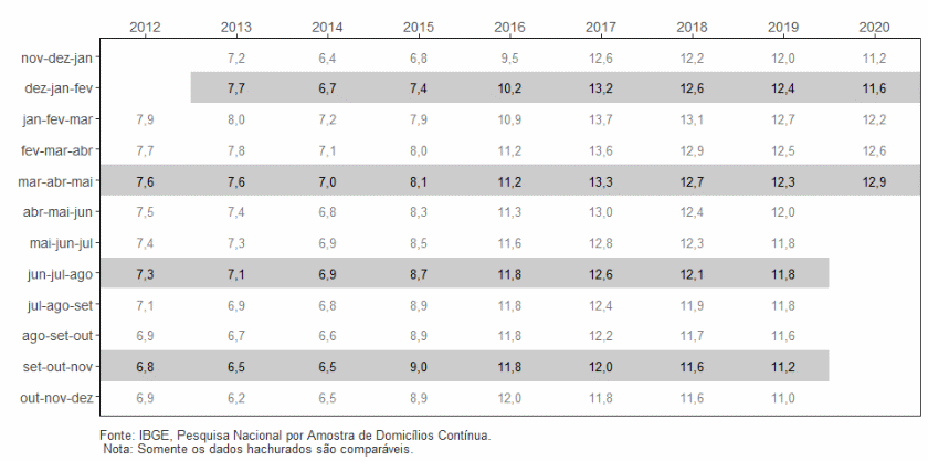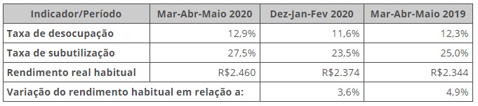 A taxa de desocupação (12,9%) no trimestre móvel encerrado em maio de 2020 cresceu 1,2 ponto percentual em relação ao trimestre de dezembro de 2019 a fevereiro de 2020 (11,6%) e 0,6 ponto percentual em relação ao mesmo trimestre de 2019 (12,3%).
