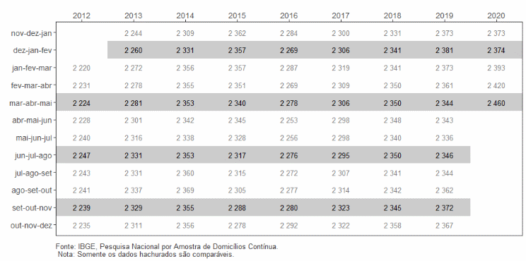 A massa de rendimento inclui apenas rendimentos provenientes de trabalho, não incluindo, portanto, rendimentos de outras fontes, tais como: Aposentadoria, Aluguel, Bolsa Família, BPC, Auxílio Desemprego, Auxílio Emergencial etc. O Auxílio Emergencial pago para as pessoas por estarem afastadas do trabalho não está incluído no rendimento de trabalho da PNAD Contínua. Os rendimentos provenientes de outras fontes são captados na PNAD Contínua de forma a serem divulgados no consolidado do ano, não permitindo, portanto, a sua disponibilização na divulgação trimestral.