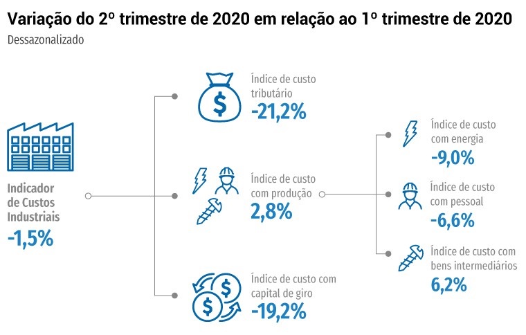 Nos componentes do índice, há quedas acentuadas, como a de 21,2% no custo tributário, devido à postergação do prazo de pagamento de impostos; queda bastante significativa de 19,2% no custo do capital de giro, que ocorreu pelas medidas de aumento da liquidez do Banco Central; e de 6,6% no custo com pessoal, provada pelos acordos de redução de jornada e salário. Houve queda de 9% no custo com energia, o que se deve à menor demanda por combustíveis devido à menor circulação de pessoas e menor atividade econômica.