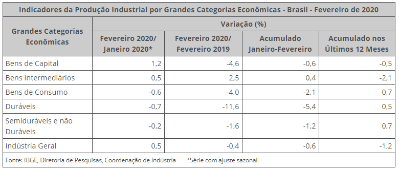 Entre as grandes categorias econômicas, ainda no confronto com igual mês do ano anterior, bens de consumo duráveis (-11,6%) assinalou, em fevereiro de 2020, recuo de dois dígitos e o mais acentuado entre as grandes categorias econômicas. Os setores produtores de bens de capital (-4,6%) e de bens de consumo semi e não-duráveis (-1,6%) também apontaram taxas negativas mais elevadas do que a média nacional (-0,4%). Por outro lado, o segmento de bens intermediários (2,5%) marcou o único resultado positivo nesse mês.