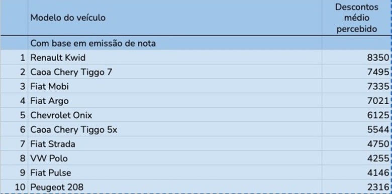A pesquisa foi feita com base em dez modelos e apresenta os descontos médios praticados nas negociações ocorridas durante a primeira semana após a entrada em vigor das medidas anunciadas pelo governo.