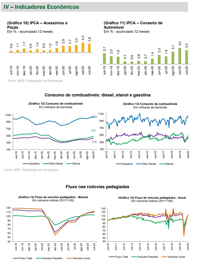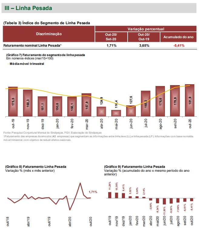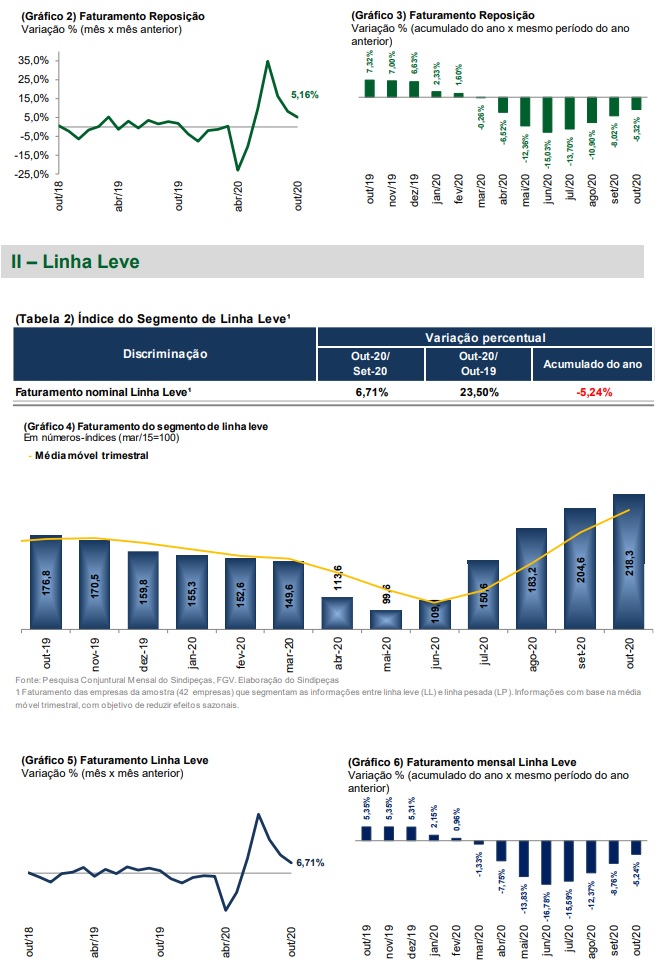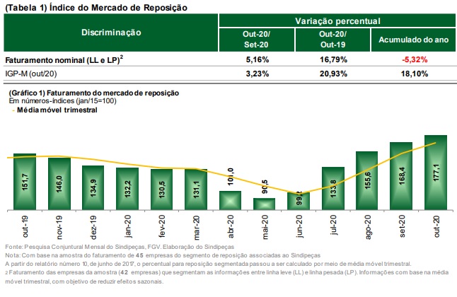 O faturamento do mercado de reposição, calculado por meio de aplicação de média móvel trimestral, registrou-se alta de 5,2% na passagem de setembro para outubro, mas manteve queda de 5,3% no acumulado do ano. Importante notar também o expressivo aumento, de cerca de 16,8% na comparação interanual (out/20 x out/19).