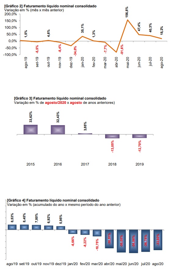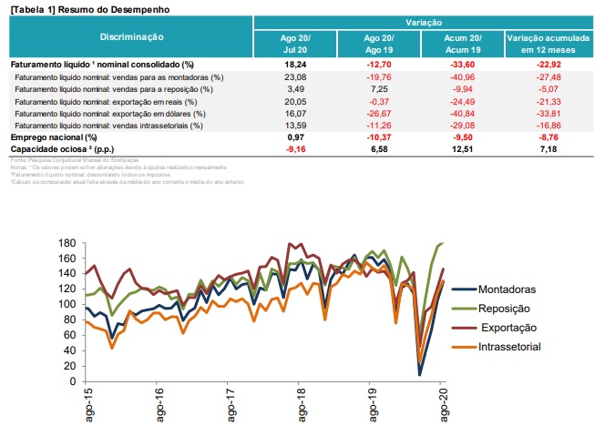 • Apesar da variação inferior à dos demais canais de distribuição, o mercado de reposição foi o único cujas vendas superaram o resultado de igual mês do ano anterior em 7,3%; • No acumulado do ano até agosto, o faturamento encara acentuada queda de 33,6% e nos últimos doze meses atingiu 23%. A continuar nesse ritmo, estima-se que a receita da indústria de autopeças ficará entre 25% e 30% abaixo da de 2019;