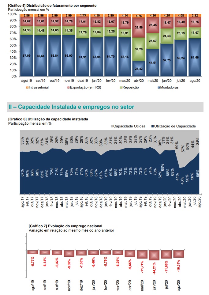 • A ociosidade no pátio fabril da amostragem da pesquisa, em agosto, voltou à patamares similares ao pré pandemia, com 66% de utilização de capacidade em agosto;