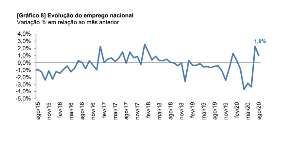 • Pelo segundo mês consecutivo, os empregos no setor voltaram a crescer em cerca de 1% na passagem mensal, mas o cenário continua ruim em 2020, com queda de 9,5% em relação ao mesmo período de 2019.