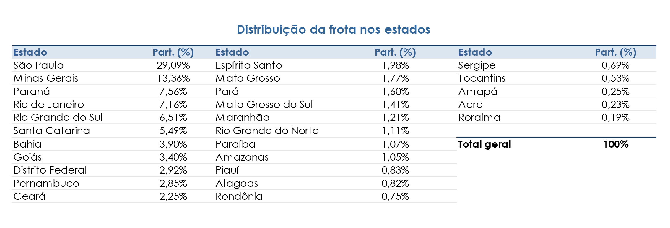 Os estados de São Paulo (29,1%), Minas Gerais (13,4%), Paraná (7,6%), Rio de Janeiro (7,2%) e Rio Grande do Sul (6,5%) abrigam em seus territórios 64% de todos os veículos em circulação no Brasil. Os 36% restantes se encontram distribuídos por 22 unidades da Federação, com participações que variam de 5,5% (Santa Catarina) a 0,19% (Roraima).