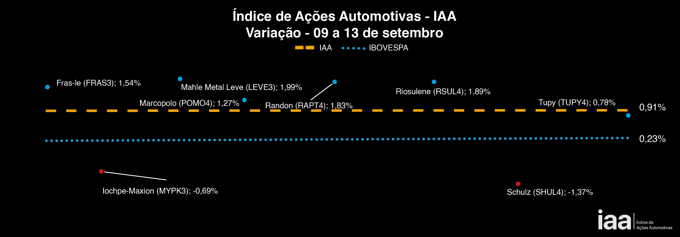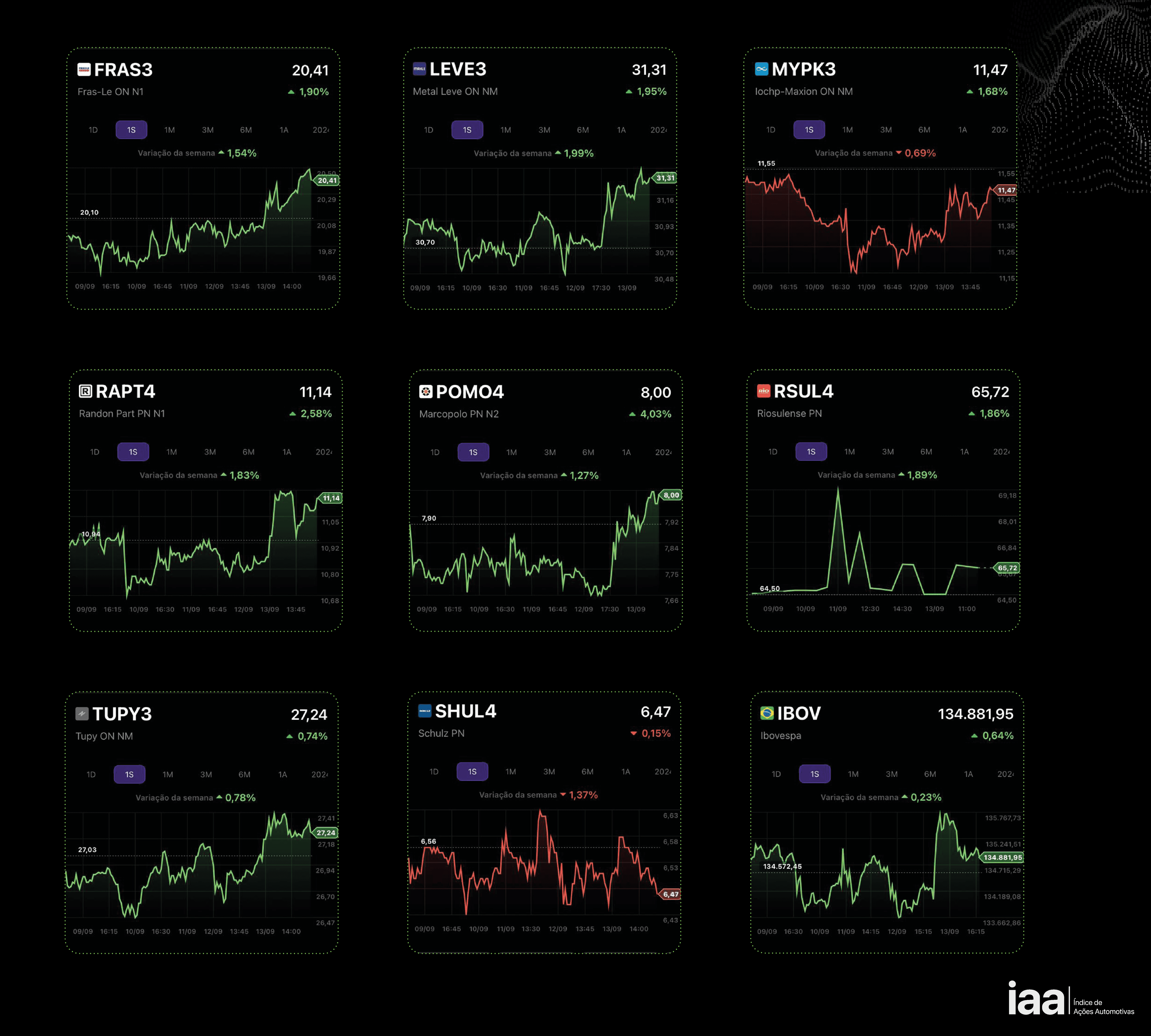 No período, as ações automotivas obtiveram variações muito próximas: Mahle Metal Leve (LEVE3) +1,99%; Riossulense (RSUL4) +1,89%; Randon (RAPT4) +1,83%; Fras-le (FRAS3) +1,54%; Marcopolo (POMO4) +1,57% e Tupy (TUPY4) +0,78%.