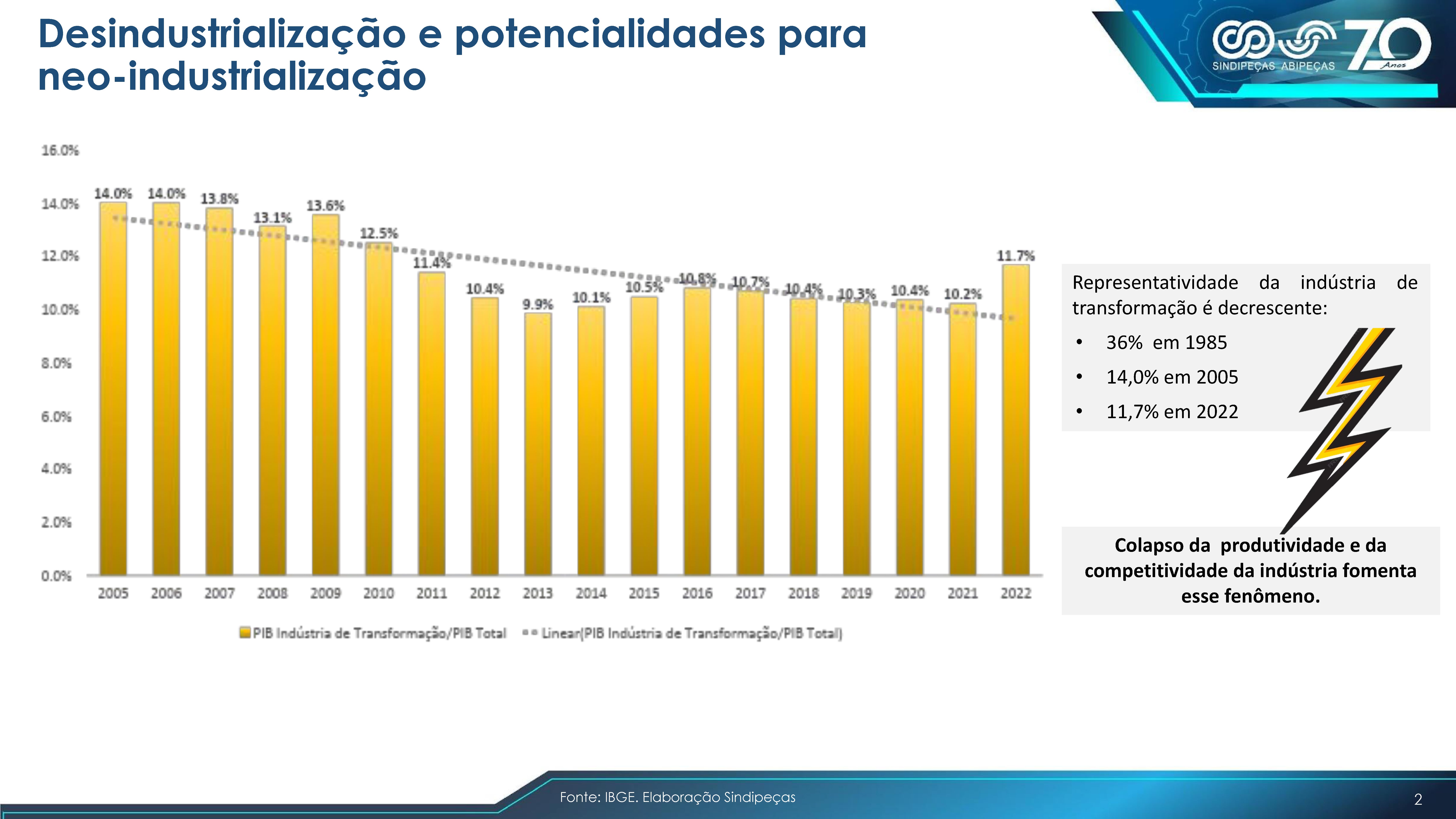 “Nos últimos anos, a indústria enfrentou o problema da perda de importância no PIB. Em 1985, respondíamos por 36%; em 2005, 14%; e acabamos chegado, em 2022, a 11,7% do PIB. Tivemos uma queda muito significativa na importância da participação industrial, e isso ocorreu por conta da perda de competitividade da nossa indústria. Conquanto as pessoas façam sua lição de casa e são competitivas do portão para dentro, do portão para fora a gente perde competividade por uma série de entraves que existem no caminho e tornam nosso produto mais caro