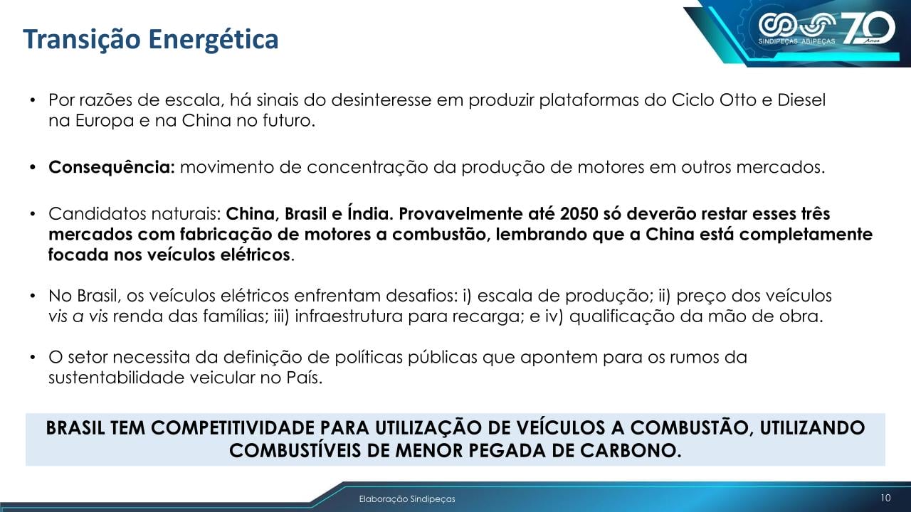 “Temos hoje uma série de rotas tecnológicas e soluções para descarbonização. A posição do Sindipeças é neutra. Entendemos que as diferentes tecnologias pró-descarbonização vão coexistir no mundo e uma ou outra vai prevalecer em cada região, conforme as suas peculiaridades. O Brasil, que é um país privilegiado pela matriz energética, pode ter todas elas. E já estamos vendo isso acontecer. Vamos ter todas, com aplicações diferentes, o que é muito bom porque nos mantêm inseridos nas cadeias globais de valores, nós podemos fornecer para todo mundo e dar essa opção para os consumidores”.
