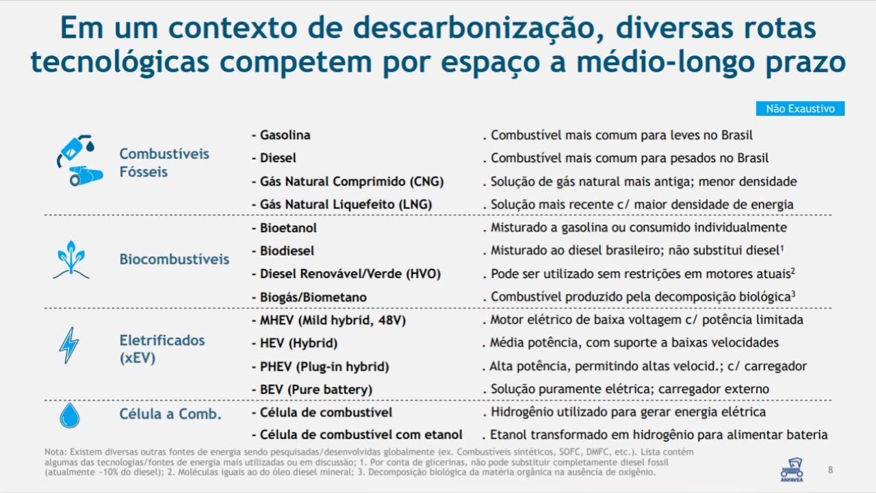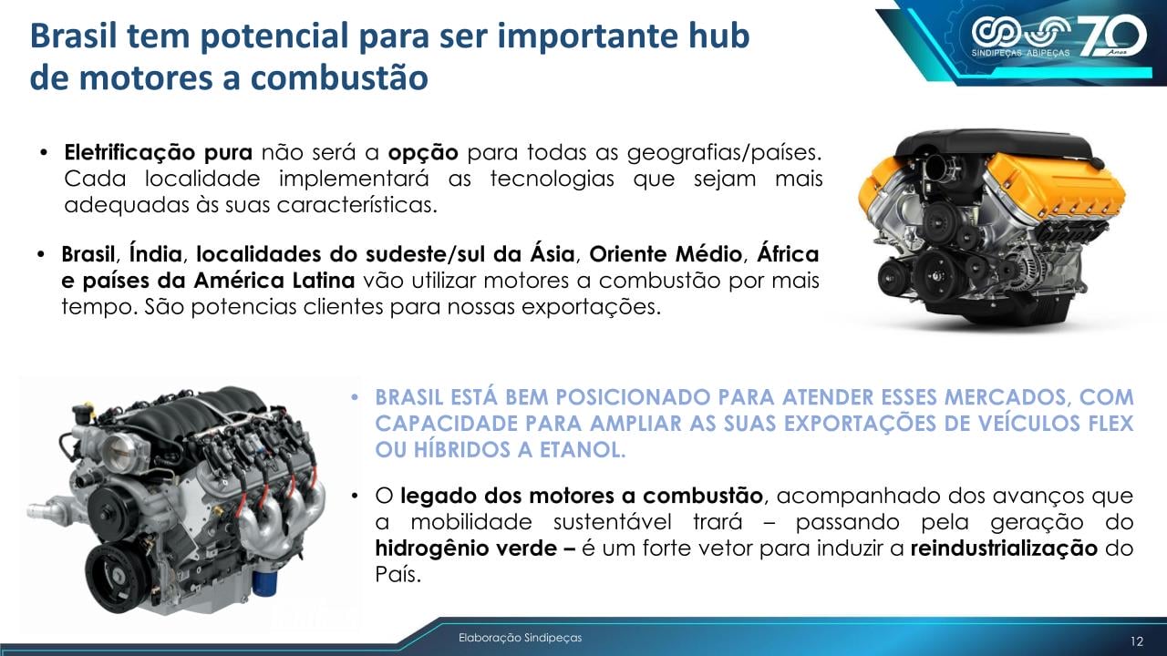 “Se o motor a combustão não vai ser mais produzido nem nos Estados Unidos e nem na Comunidade Europeia, alguém vai ter que produzir para o mundo. Aí surge a oportunidade para o Brasil. Nós estamos desenvolvendo tecnologias pró-descarbonização mas, em paralelo, surge essa oportunidade de o Brasil se tornar um centro mundial de produção e exportação de motores e veículos a combustão. Temos a convicção de que Brasil, Índia, localidades da Ásia, Oriente Médio, África e países da América Latina vão continuar utilizando o motor a combustão por muito tempo e esses povos são potenciais clientes das nossas exportações”.