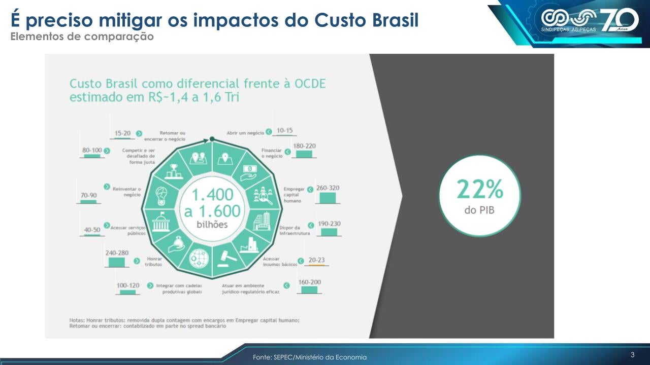 “O principal problema é o que nós chamamos de Custo Brasil, que na verdade é uma salada de problemas e entraves de toda ordem e que hoje representa 22% do PIB. Ou seja, nós somos um país onde temos que competir com as empresas de fora carregando uma bola de ferro amarrada na perna. É assim que nós entramos na raia para fazer a corrida”