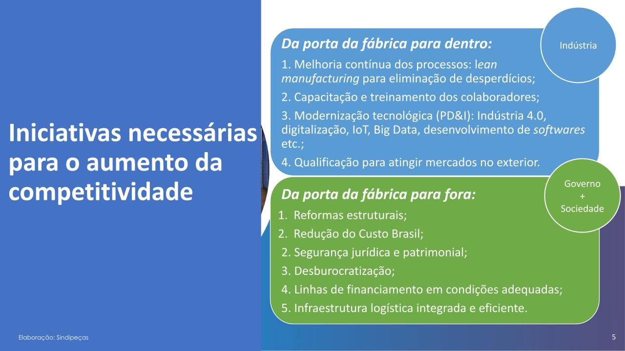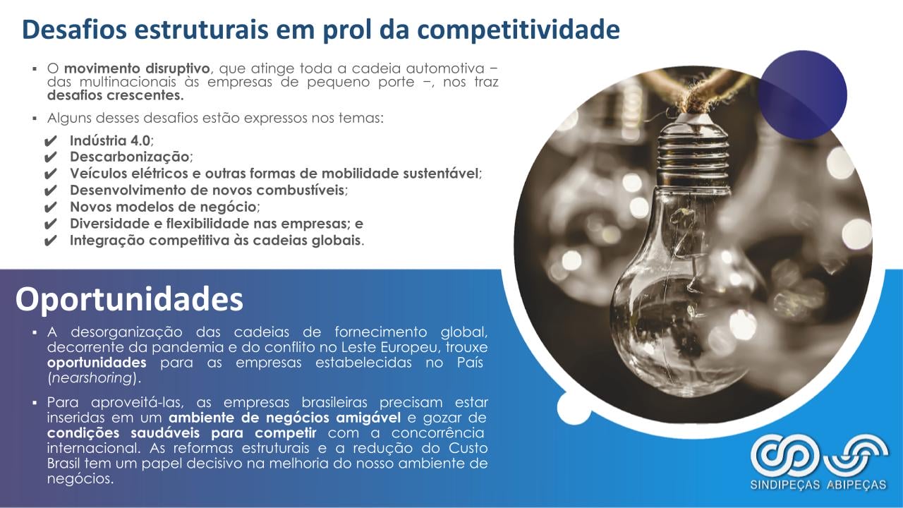 “Da porta para dentro somos competitivos, estamos fazendo a lição de casa. Mas, da porta para fora, temos problemas. Precisamos demais de reformas estruturais como a tributária, que é a mais importante. Temos problemas de segurança jurídica e patrimonial, nossos concorrentes lá fora nem sabem o que é ter um vigia armado na fábrica 24 horas por dia. E o custo de compliance fiscal e tributário, que faz com que você tenha contingentes de pessoas dentro da empresa simplesmente para cumprir obrigações acessórias. Nossos concorrentes lá fora não têm isso. A dificuldade que temos, ainda, para obter financiamento com taxas de juros adequadas, a nossa infraestrutura logística que é muito deficiente e cara. Tudo isso precisa ser melhorado para sermos mais competitivos”.