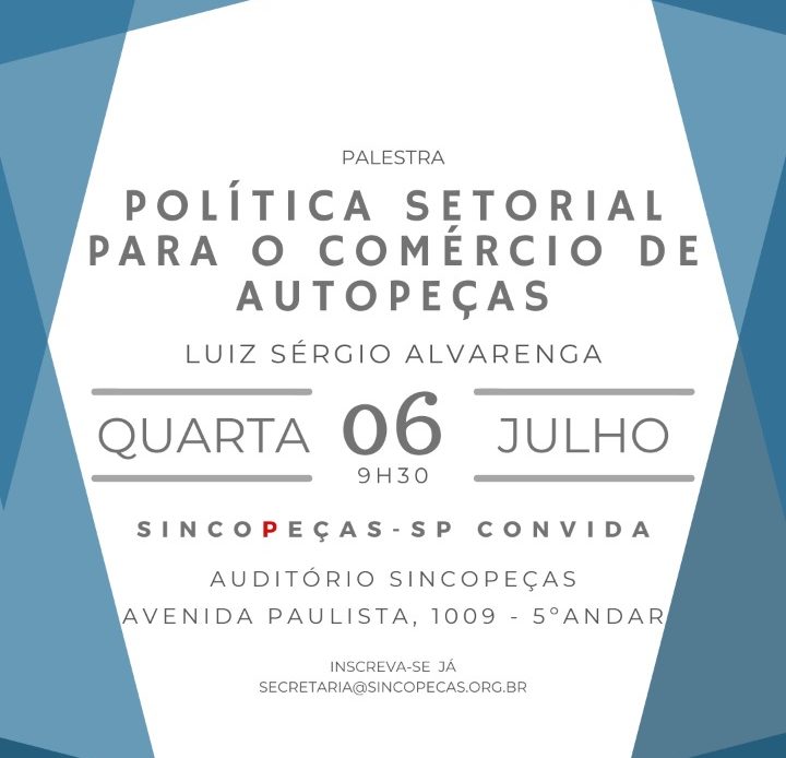 Essa é a sinopse da palestra “Política setorial para o comércio de autopeças”, que será apresentada pelo diretor da Alvarenga Projetos Automotivos, Luiz Sérgio Alvarenga, no próximo dia 06 de julho, a partir das 9h30, no auditório do Sincopeças-SP, à avenida Paulista, 1.009, 5º andar.