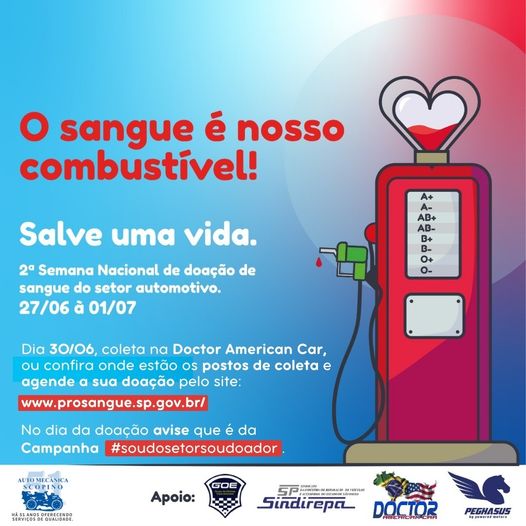 A 2ª Semana Nacional de doação de sangue do setor automotivo vai acontecer de 27/06 a 01/07. No dia 30 de junho haverá coleta na Doctor American Car. Confira os outros postos de coleta e agende a doação em prosangue.sp.gov.br. A ação, apoiada pelo Sindirepa-SP – Sindicato da Indústria de Reparação de Veículos e Acessórios do Estado de São Paulo, é uma iniciativa do GOE – Grupo das Oficinas Especializadas junto com a Peghasus Powered Motors e Doctor American Car.