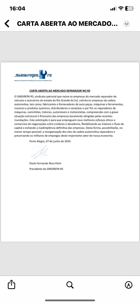 Dirante deste cenário, o Sindirepa RS solicita a empresas da cadeia automotiva – indústrias, distribuidores e varejo de autopeças a promoverem inciativas de ajuda e apoio a oficinas mecânicas atingidas pela enchete. Confira a íntegra da carta: