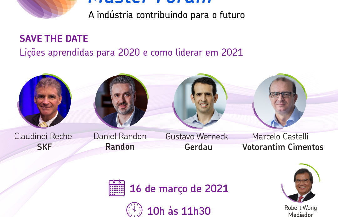 Com a mediação do consultor executivo Robert Wong, o fórum contará com a participação de Daniel Randon, presidente e CEO das empresas Randon, Gustavo Wernek, presidente e CEO da Gerdau, Marcelo Castelli, CEO Global da Votorantin Cimentos e Claudinei Reche, presidente da SKF Latam.