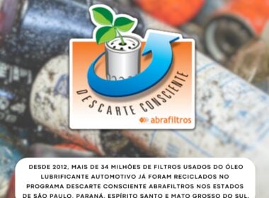Desde 2012, mais de 34 milhões de filtros usados do óleo lubrificante automotivo já foram reciclados no programa Descarte Consciente Abrafiltros nos estados de São Paulo, Paraná, Espírito Santo e Mato Grosso do Sul.
