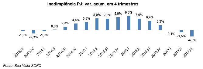 Após praticamente três anos de elevações, o fluxo de inadimplência das empresas a partir do 2º trimestre 2016 entrou em desaceleração devido ao movimento de restrição de crédito por parte dos concedentes, tendo como consequência amenização dos fluxos de inadimplência na análise de longo prazo (acumulados em quatro trimestres). Para os próximos trimestres espera-se a manutenção dos baixos níveis de inadimplência, uma vez que a retomada da atividade econômica, menor inflação e diminuição dos juros deverão proporcionar um cenário mais favorável para o ambiente empresarial.