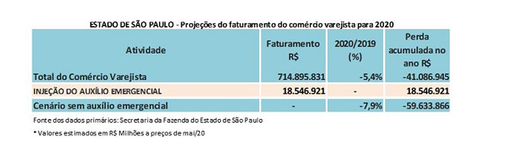 Segundo dados oficiais, em torno de R$ 18,5 bilhões serão destinados à população paulista como auxílio emergencial ao longo do ano. Diante desse dado, o impacto desse pagamento evitou que a queda de vendas do comércio estadual paulista atingisse quase 8% neste ano, reduzindo a projeção para 5,4%. Isso significa que o prejuízo do varejo poderia alcançar quase R$ 60 bilhões, aprofundando ainda mais o grave cenário.