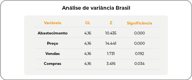 Os níveis de vendas mantiveram-se positivos e com oscilações para cima e para baixo entre 2020 e 2023, mas decaíram para desempenho negativo em 2024. Já o nível de compra performou valores positivos em 2020 a 2022 e em 2024, com pico no ano de 2020 (2,54%). Na análise da anova, contudo, nenhuma variável apresentou diferenças estatisticamente significantes.