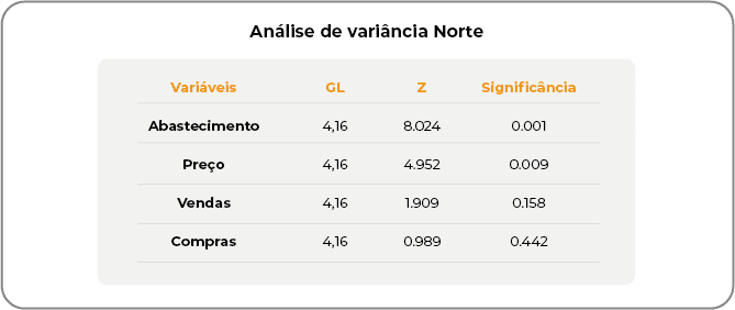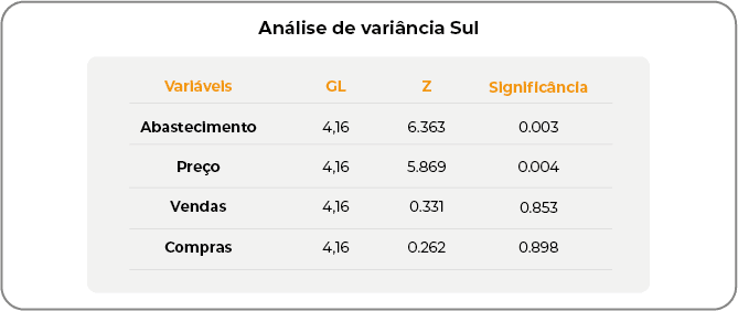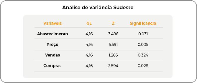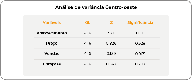 Houve queda acentuada nos níveis de abastecimento em 2021 (-16,88%), sendo o menor nível observado entre todas as regiões, com recuperação em 2022 e 2023 e nova queda em 2024. Os níveis de preços aumentaram de 4,26% em 2020 para 11,38% em 2021, e mantendo percentuais constantes em 2023 e 2024 (1,51%), sendo este o pior resultado observado. As vendas tiveram pico de desempenho negativo em 2021 (-10%), recuperando-se para valores positivos nos anos seguintes e fechando 2024 em -1,33%. Por sua vez, as compras apresentaram seu melhor desempenho em 2022 (4,38%) e o pior em 2024 quando foi observado -6,84% na média da variação. Na análise ANOVA, verificamos que vendas e compras foram constantes (sem diferença estatisticamente significativa ao longo dos anos).