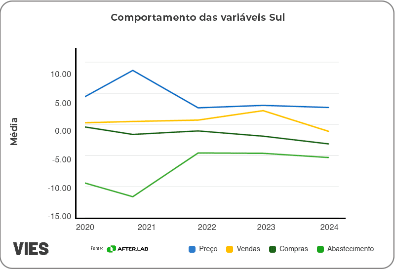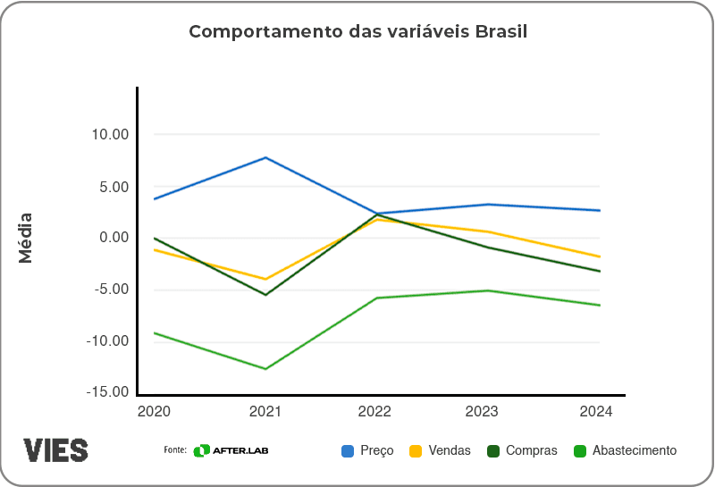 O abastecimento exibiu -15,62% em 2021. Apesar das seguidas recuperações nos anos seguintes, os níveis de abastecimento continuaram negativos, fechando 2024 em -5,03%. Os preços atingiram um pico positivo de 6,58% em 2021 e atingiram seu pior desempenho em 2023: 1,85%.