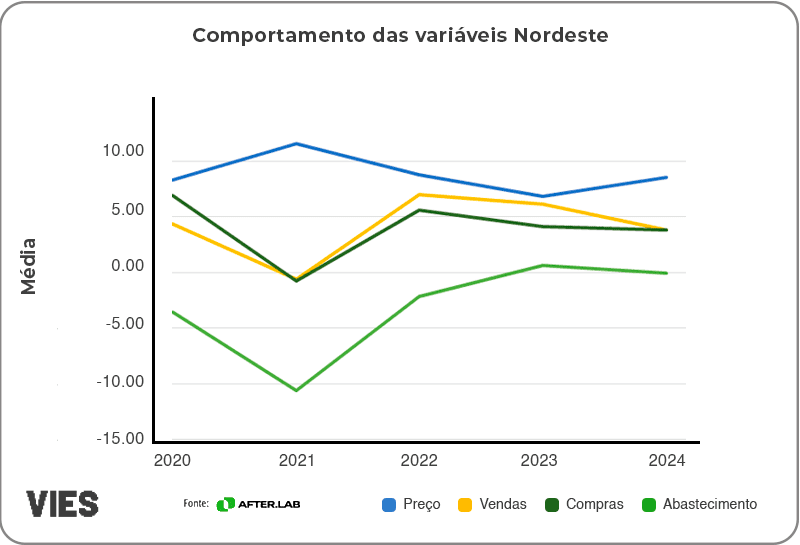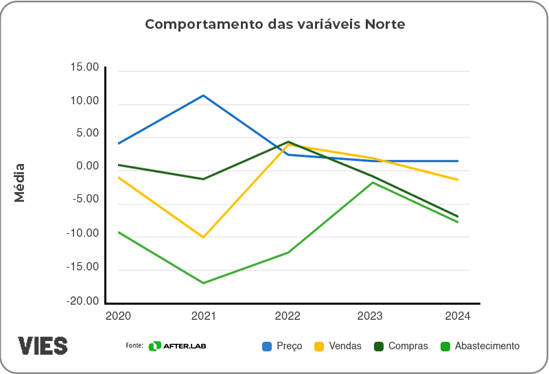 Os níveis de abastecimento apresentaram um comportamento similar visto nas demais regiões e também em meses anteriores. Isso pois o pior desempenho foi visto mais uma vez em 2021 (-11,62%), seguido de anos de recuperação, fechando novembro de 2024 em -5,31%. Já o preço desempenhou comportamento parecido com as demais regiões, com pico positivo em 2021 (8,68%) e pior desempenho no ano seguinte (2,66%).