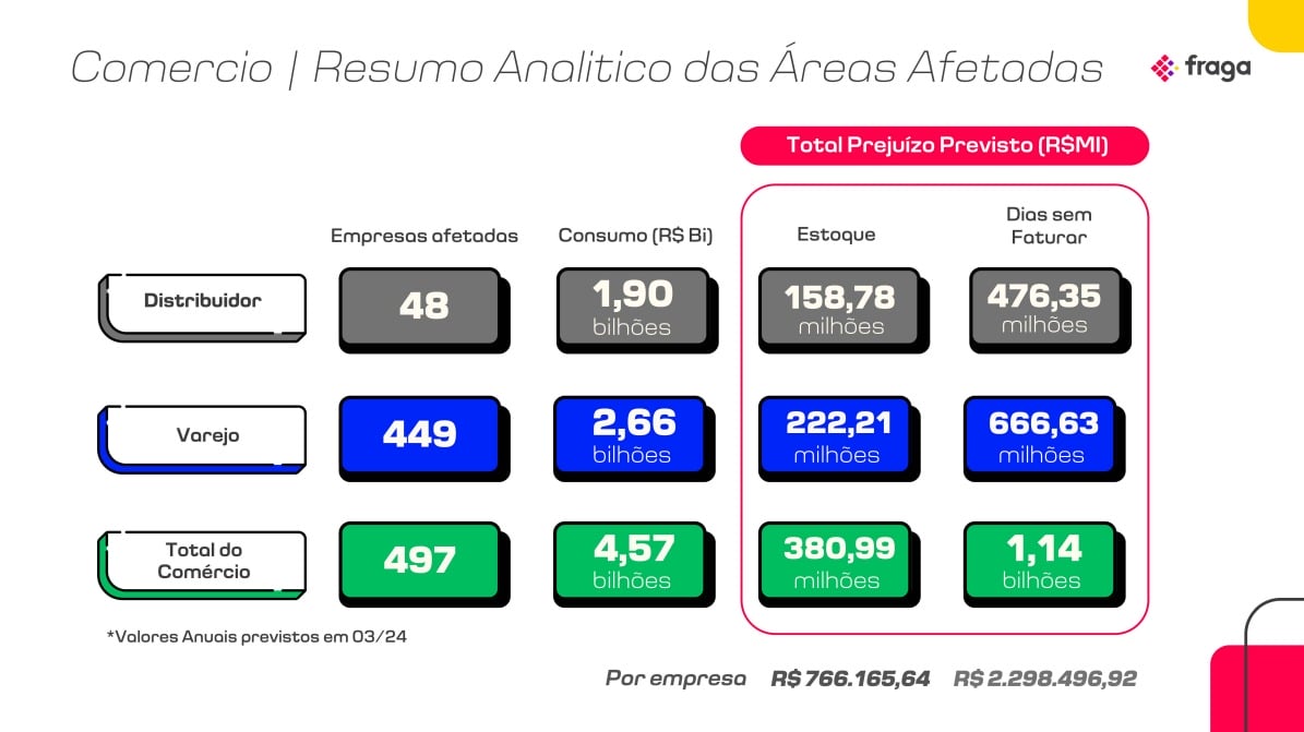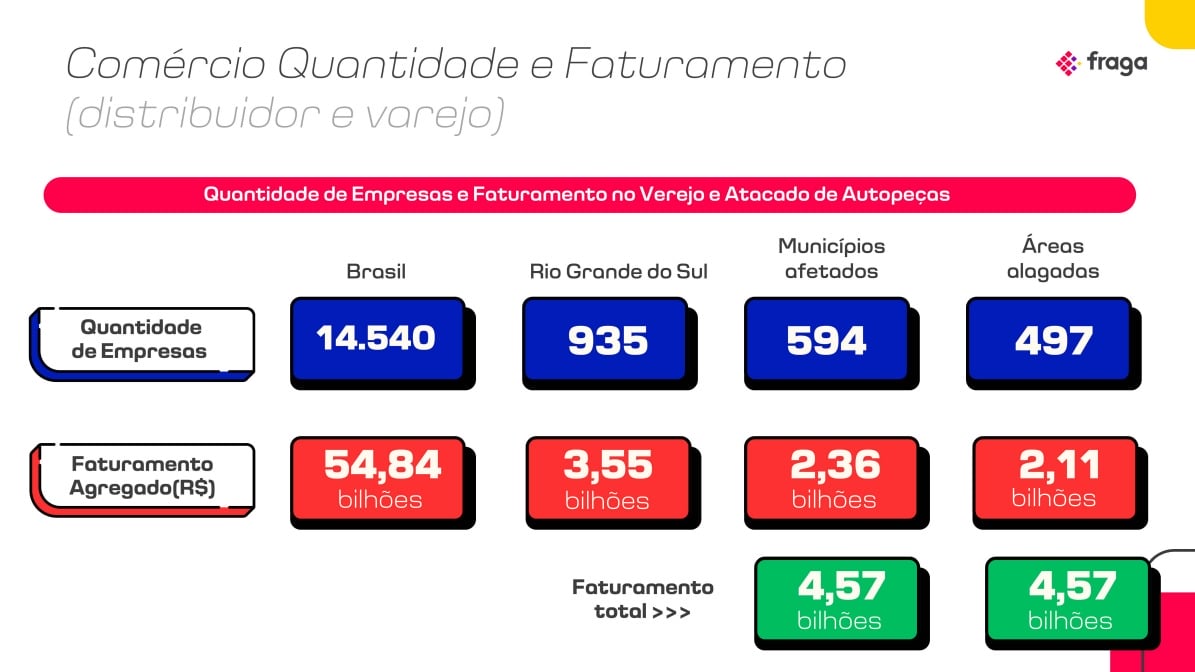 Se os impactos da tragédia gaúcha foram enormes na reparação, na distribuição e no varejo eles também foram gigantescos. De acordo com o levantamento da Fraga Inteligência Automotiva, 497 dos 935 estabelecimentos dos segmentos no Rio Grande do Sul foram afetados pelos alagamentos – juntos, eles representem um faturamento agregado anual de R$ 2,11 bilhões. Além de terem tido essa receita comprometida, varejo e distribuição carregam com eles agora um problema tão ou mais dramático: a perda de estoques. Segundo Danilo Fraga, boa parte das peças que ficaram imersas na água se tornam irrecuperáveis causando um prejuízo estimado – apenas no âmbito dos estoques – na casa dos R$ 380 milhões. “Cada empresa teve, em média, um prejuízo de R$ 766 mil em perda de produtos estocados. Para além de tudo isso, é importante ressaltar o prejuízo que essas empresas terão se estimarmos os dias sem faturar enquanto atravessamos o período de reconstrução. Nesse cenário, estimamos um valor na casa de R$ 1,14 bilhão sendo R$ 666,63 milhões do varejo e R$ 476,35 da dis – tribuição”, expôs Danilo Fraga.