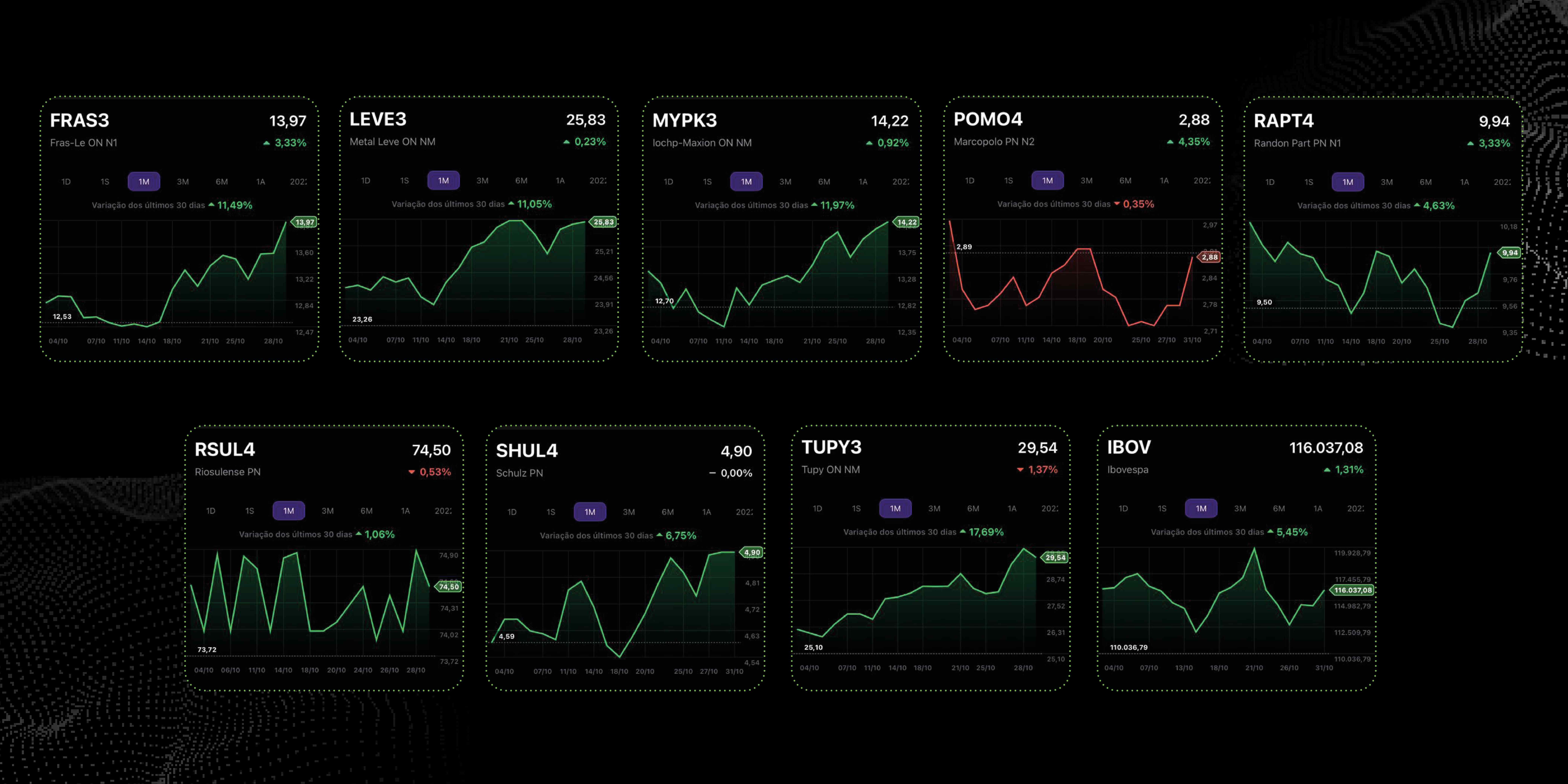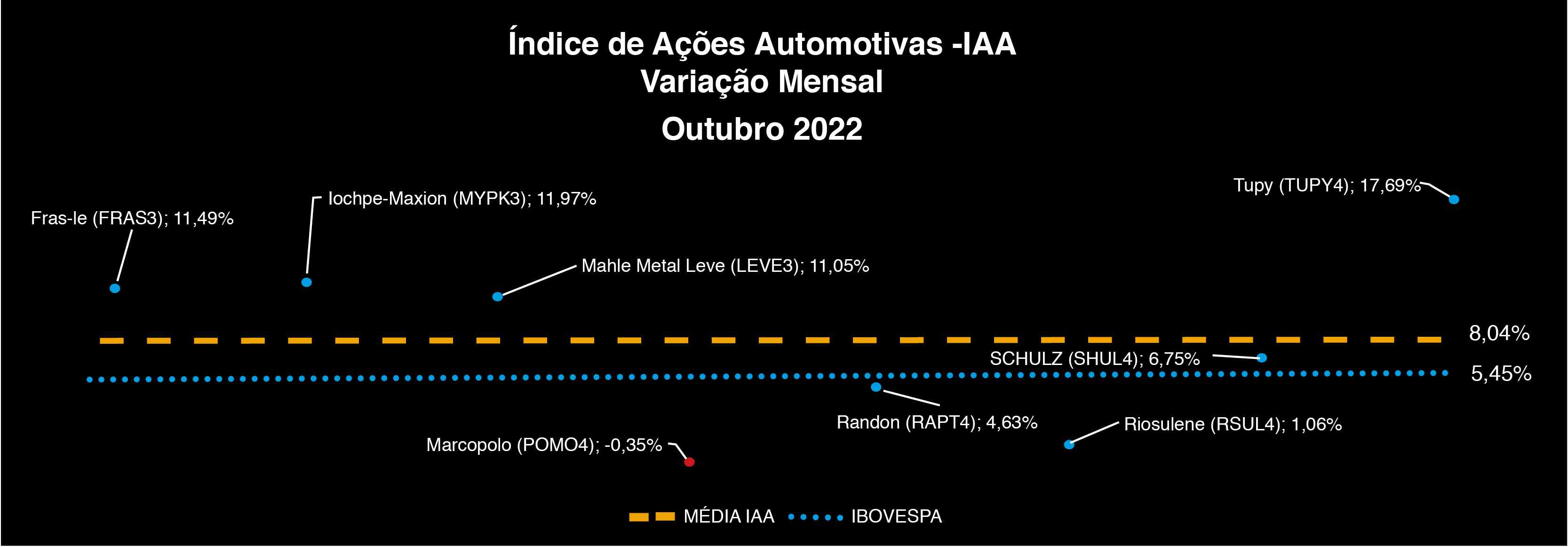 Em outubro, as ações de empresas automotivas listadas na Bolsa de Valores que registraram médias positivas foram: Tupy (TUPY4) 17,96%; Iochpe-Maxion (MYPK3) 11,97%; Fras-le (FRAS3) 11,49% e Mahle Metal Leve (LEVE3) 11,05% e Schulz (SCHUL4) 6,75%; Randon (RAPT4) 4,63% e Riosulense (RSUL4) 1,06%