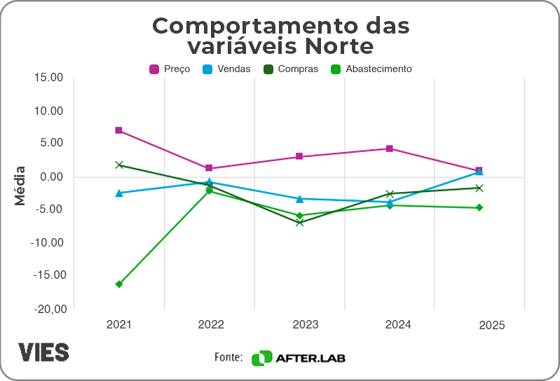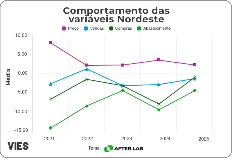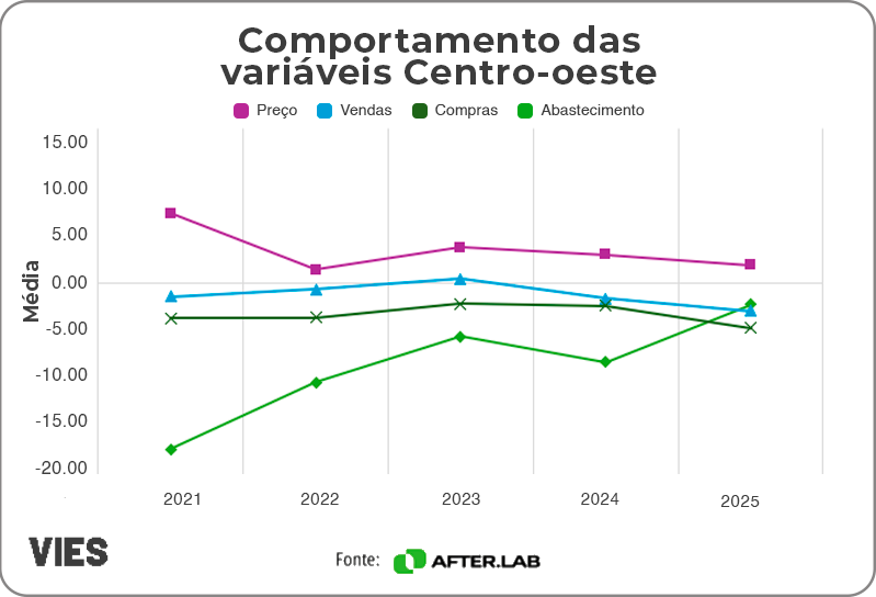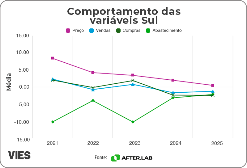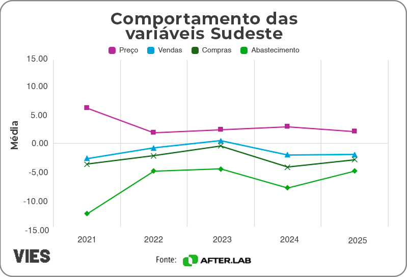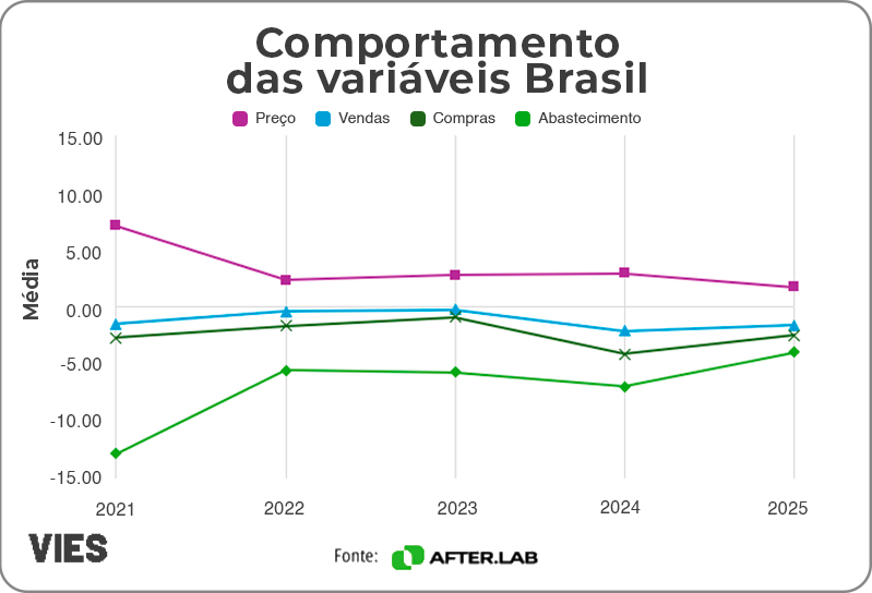 Cenário mostra recuperação gradual no abastecimento, que saiu de uma forte retração em 2021 (-12,6%) para queda mais suave em 2025 (-5%). Os preços continuam em trajetória de alta desde 2021, mas com variações menores nos últimos anos. Já as vendas oscilaram entre leves crescimentos e quedas, sem tendência clara de retomada, enquanto as compras mantiveram desempenho instável.