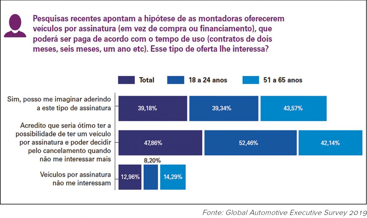 A boa receptividade ao conceito foi constatada pelo capítulo brasileiro da pesquisa Global Automotive Executive Survey 2019. De acordo com o estudo, a possibilidade de assinar o uso de um carro por prazos preestabelecidos, pagando pelo tempo de uso, foi avaliada como ótima por metade dos entrevistados. E 40% dos brasileiros se imaginam aderindo a essa nova proposta. Naturalmente, a aceitação à novidade é maior entre o público jovem, aquele que mais valoriza a mobilidade em detrimento à propriedade do veículo.