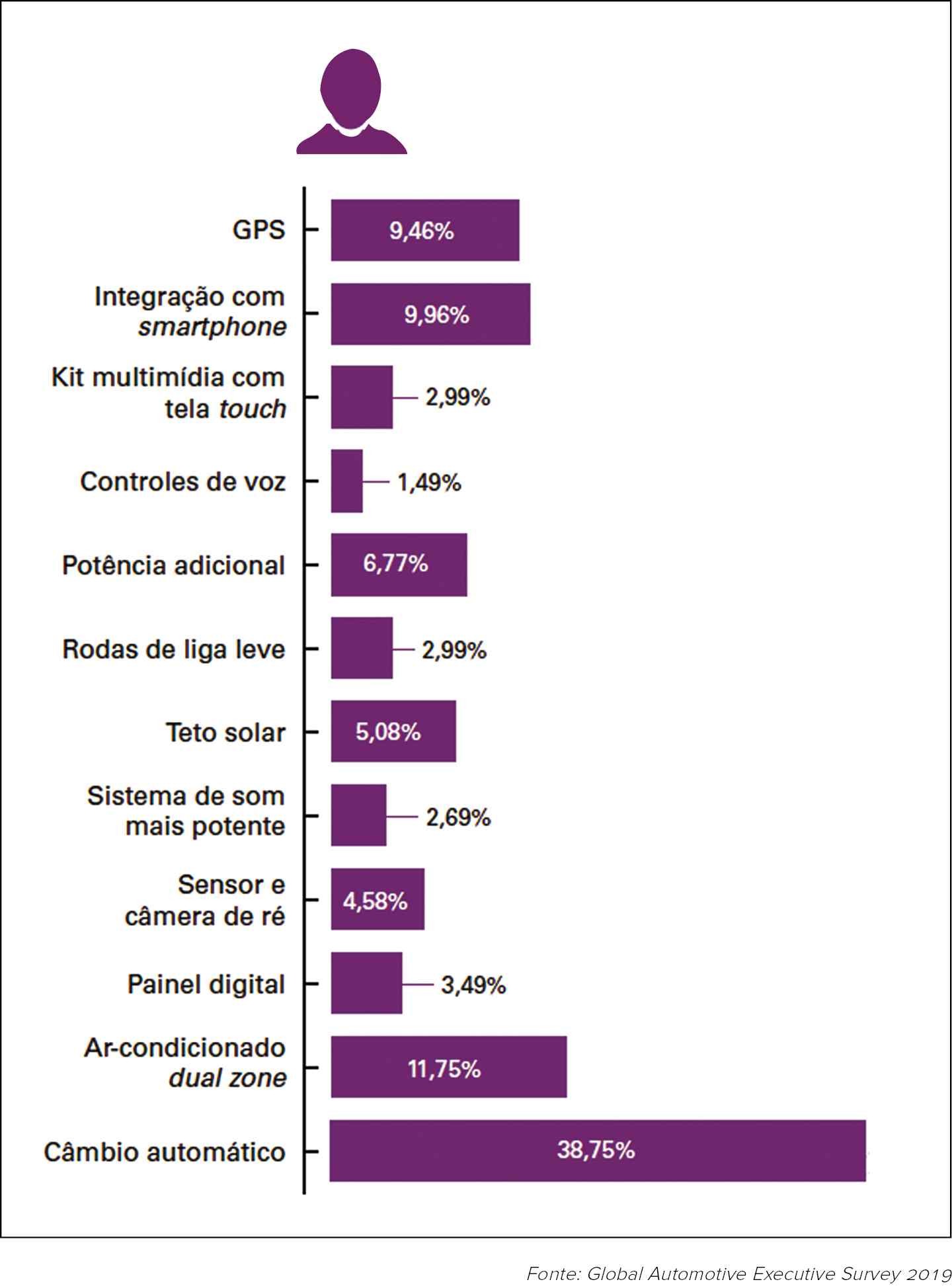 De acordo com o estudo, 38,75% dos entrevistados priorizam esse acessório no momento da compra. O índice é quatro vezes maior que o segundo item priorizado, a integração com o smartphone – esse sim um legítimo filho da inovação tecnológica que vem tomando conta dos carros brasileiros.