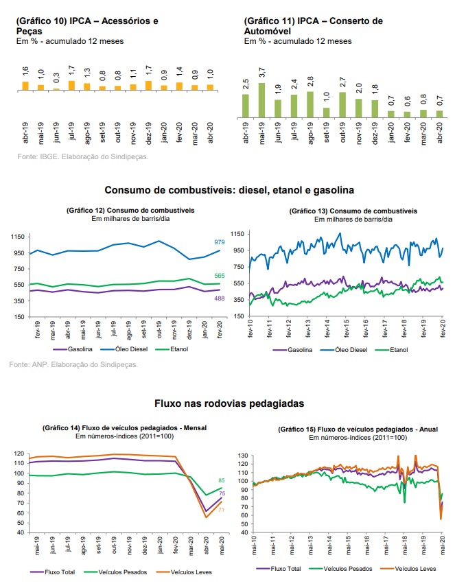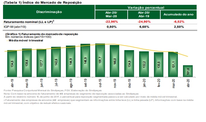 Na interpretação da entidade, a despeito da comercialização de peças por meio de canais eletrônicos, o resultado simboliza o impacto do fechamento das lojas físicas do varejo, das concessionárias de veículos e a imposição de isolamento social em várias cidades do país. Na comparação interanual, a queda foi de 24,9% e no acumulado até abril, 6,5%.