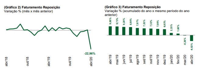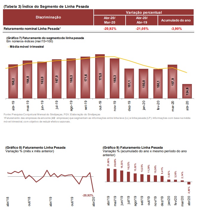 No que se refere às peças comercializadas para os veículos pesados, houve queda menor da receita nominal – de aproximadamente 20% – tanto na comparação com março desse ano quanto igual mês do ano anterior. No acumulado até abril, o faturamento foi 4,0% inferior ao de igual período de 2019.