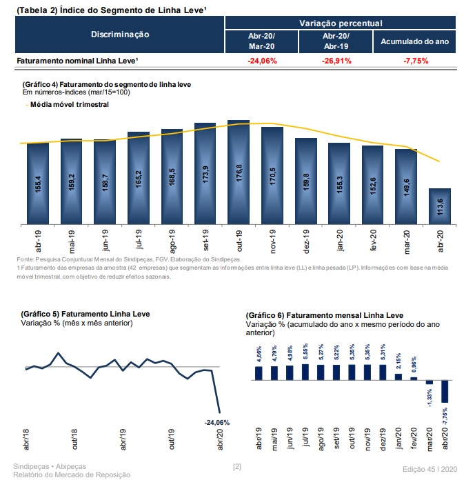 O trabalho do Sindipeças mais uma vez ratifica o maior impacto no segmento de veículos leves, cuja participação no mercado é a mais expressiva. Neste segmento, a queda no faturamento mensal foi de 24,1% e de 7,8% no acumulado do ano até abril. Além dos fatores mencionados, o Sindipeças destaca ainda que é preciso considerar o forte recuo no índice de confiança do consumidor de 80,2 para 58,2 pontos entre março e abril, respectivamente.