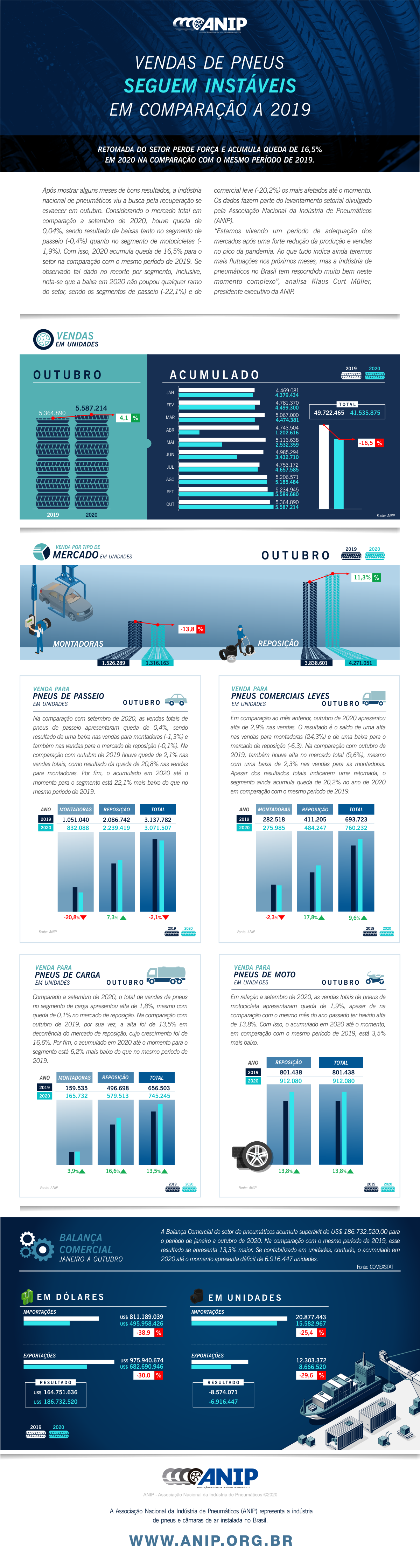 A Associação Nacional da Indústria de Pneumáticos (ANIP) divulgou na última quinta-feira (12) o levantamento setorial de vendas de pneus referente ao mês de outubro de 2020.