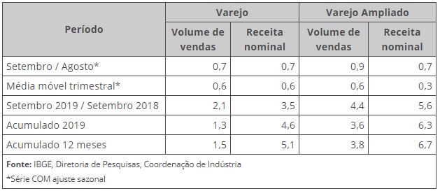 Em relação ao volume de vendas em setembro, o varejo ampliado cresceu 0,9% frente a agosto de 2019, na série com ajuste sazonal, com predominância de taxas positivas, alcançando também veículos, motos, partes e peças (1,2%) e Material de construção (1,5%), ambos, respectivamente, após recuos de 1,7% e 0,6% registrados no mês anterior.
