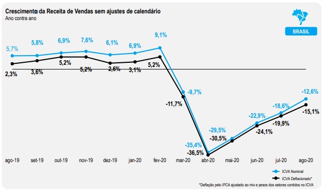 A pandemia da covid-19 continua a impactar os resultados do Varejo. Em agosto, descontada a inflação, as vendas recuaram 15,1% em comparação com o mesmo mês do ano passado. Em termos nominais, que espelham a receita de vendas observadas pelo varejista, a queda do ICVA foi de 12,6%.