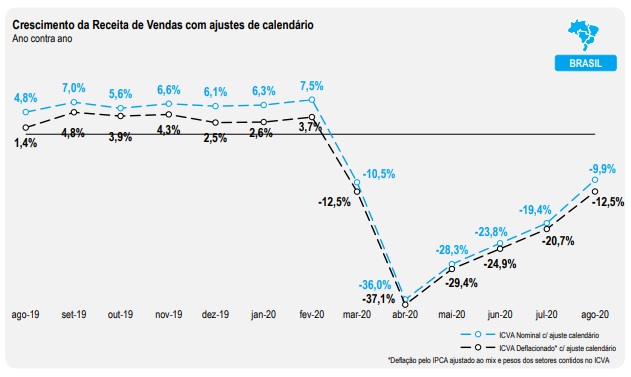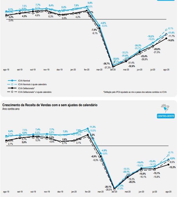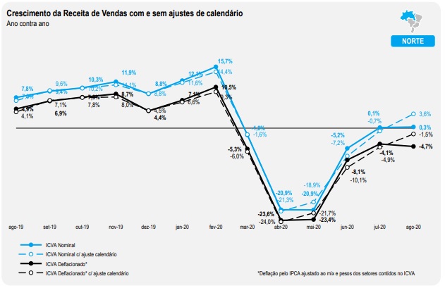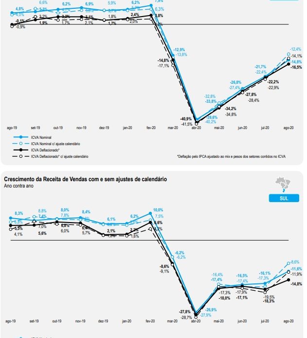 Todas as regiões registraram queda nas vendas em relação a agosto de 2019. Segundo o ICVA deflacionado com ajuste de calendário, a região Sudeste apresentou a maior retração em agosto de 2020: -14,1%. Na sequência aparecem as regiões Sul (-11,9%), Nordeste (-11,7%), Centro-Oeste (-9,5%) e Norte (-1,5%).