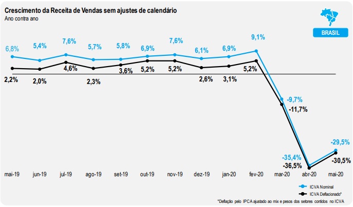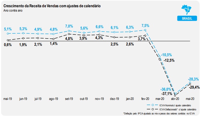 O calendário prejudicou levemente maio deste ano em comparação com maio de 2019. Sendo assim, o ICVA deflacionado com ajuste de calendário registrou queda de 29,4% e 28,3% em termos nominais.