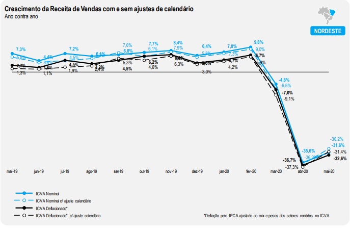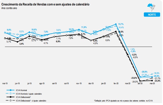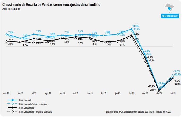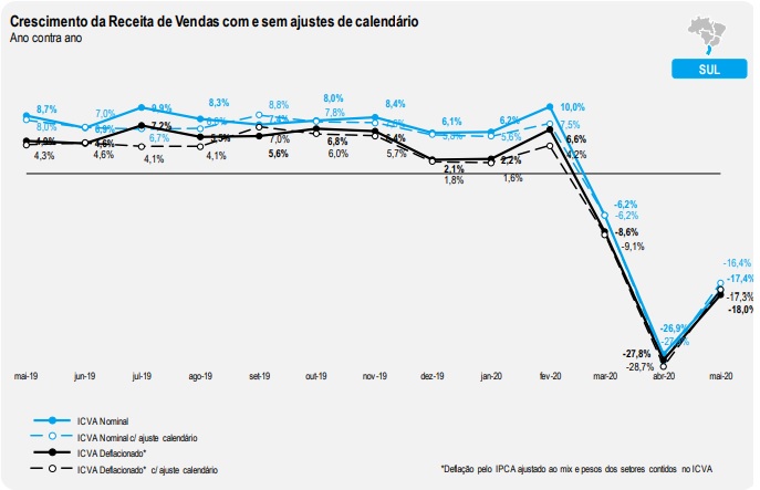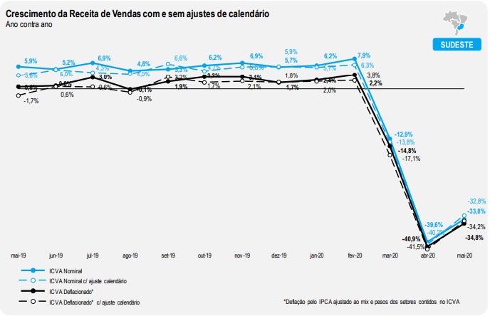 Todas as regiões apresentaram queda em relação a maio de 2019. Segundo o ICVA deflacionado com ajuste de calendário, a região Sudeste apresentou a maior queda em maio de 2020: -34,2%. Na sequência aparecem as regiões Nordeste (-31,4%), Norte (-21,7%), Centro-Oeste (-19,2%) e Sul (-17,3%).