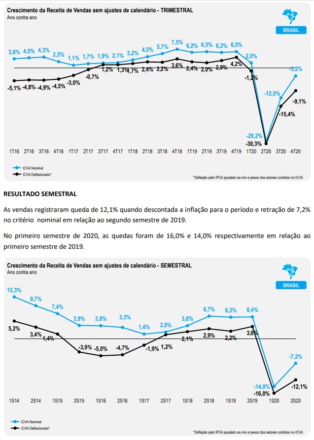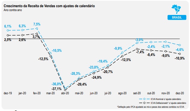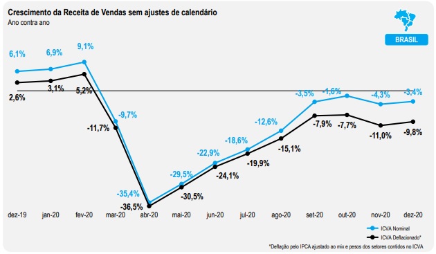 As vendas no Varejo brasileiro caíram 9,8% em dezembro, descontada a inflação, em comparação com o mesmo mês de 2019. Em termos nominais, que espelham a receita de vendas observadas pelo varejista, o ICVA apresentou queda de 3,4%.