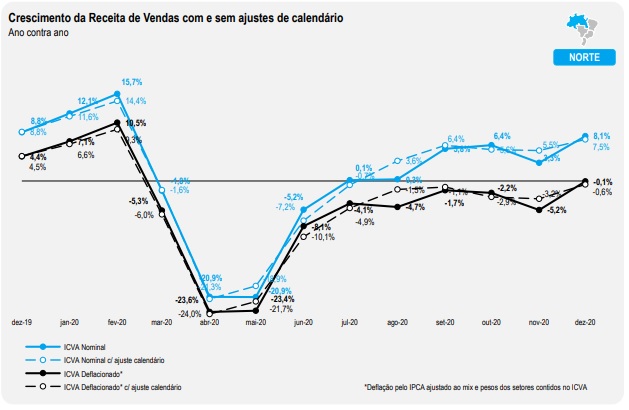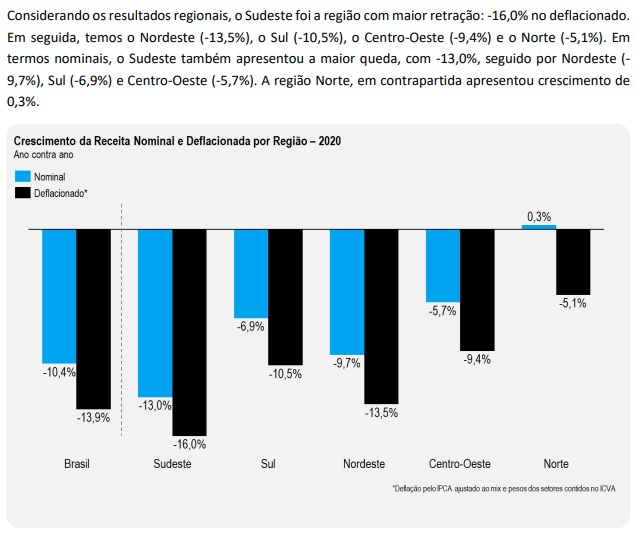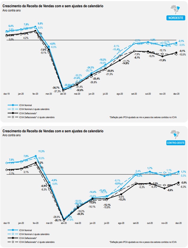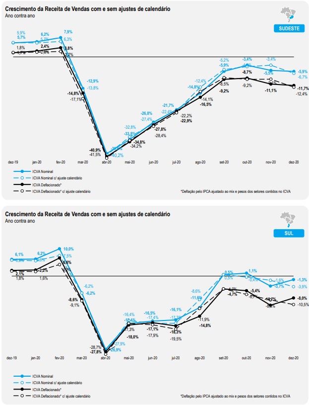 Exceto na região Norte, todas as demais regiões do país apresentaram desaceleração na passagem mensal de acordo com o ICVA deflacionado e com ajuste de calendário. Na região Sudeste, a queda foi de 12,4%, seguida das regiões Nordeste (-10,5%), Sul (-10,5%), Centro-Oeste (-6,3%) e Norte (-0,6%).