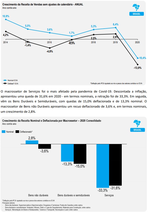 As vendas no varejo brasileiro caíram 13,9% em 2020, descontada a inflação, em comparação com 2019, de acordo com o Índice Cielo do Varejo Ampliado (ICVA). É o pior resultado desde 2014, quando o índice começou a ser calculado. Em termos nominais, que espelham a receita de vendas observadas pelo varejista, o ICVA em 2020 apresentou queda de 10,4%.