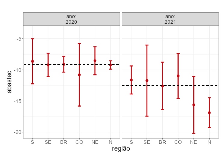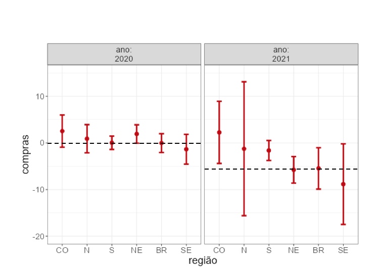 O próximo gráfico apresenta a comparação entre novembro de 2020 e novembro de 2021 na dimensão compras. A leitura do gráfico com os dados relativos ao ano de 2020 é inequívoca: as compras foram positivas na média nacional (na verdade 0,67%, desprezível dentro do plano amostral, mas ainda assim positiva), com destaque para todas as regiões e uma queda na região Sudeste. Quando se observa o gráfico relativo ao ano de 2021, a variação negativa nas compras na média nacional passa a ter alguma relevância estatística, e o destaque novamente vai para a região Centro-Oeste que segue com valores positivos, diferentemente das demais regiões brasileiras.