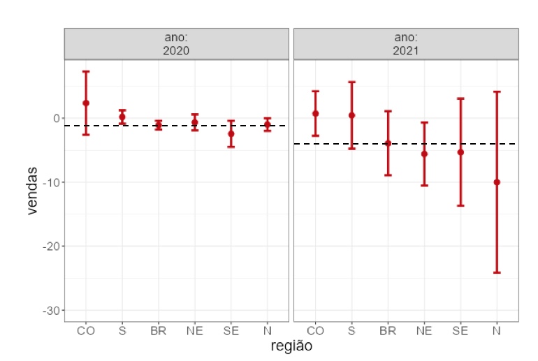 referência o fato de que a coleta de dados é feita semanalmente e os entrevistados são solicitados a comparar o desempenho da semana que se encerra com a semana anterior, os resultados encontrados em nossas análises estatísticas são de extrema precisão para retratar os humores no comércio de autopeças. Observando o lado esquerdo do gráfico, relativo ao ano de 2020, notamos que a média e a variabilidade dos dados (expressa pelos limites inferior e superior da linha vertical vermelha) estavam de certa forma “achatados” na média brasileira e nas regiões Sul e Norte. Para fins de comparação, em novembro de 2020 a média nacional da queda de vendas era de -0,435%, ou seja, desprezível considerando o erro de medição associado ao tipo de delineamento de pesquisa. Já em 2021 a mesma média nacional passou para -3,95%, mas com indicadores de crescimento nas regiões Centro-Oeste e Sul, como fica evidenciado no lado direito do gráfico.